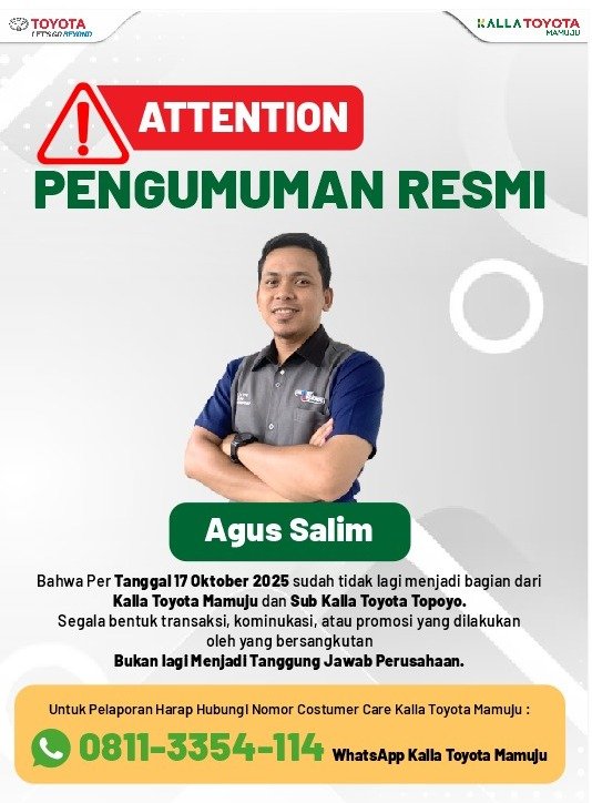 Bapak/Ibu, Kami menginformasikan bahwa karyawan atas nama Agus Salim sudah bukan lagi karyawan Kalla Toyota. Segala bentuk transaksi, komunikasi atau promosi yang dilakukan oleh yang bersangkutan bukan tanggung jawab perusahaan.